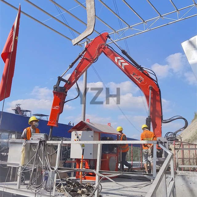 When excavating and processing rock, the primary stone crusher becomes blocked by larger pieces of boulders and it is precisely the pedestal boom system which solves the dangerous and laborious problem of clearing these boulders in the crusher. It is also used during primary crushing on frames. The relevant parameters chosen for the pedestal boom system depend on the given use: size and method, reaches, lifting capacity, the size of the hydraulic hammer and the output of the hydraulic unit.